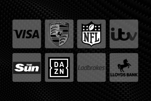 NFL, F1, Porsche, Visa, Lloyds Bank, RBS, U.S. Bank, SKY, ITV, DAZN, The Sun, Ladbrokes, Entain, Vodafone, O2, Channel 5, Deezer, Canal+, and First Direct.